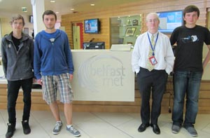 Joshua Hahn, Florian Martens (von links) und Fabian Wloch (ganz rechts) unterstützten tatkräftig das IT-Support Team des Belfast Metropolitan Collegevon Brian McGee (2. von rechts).