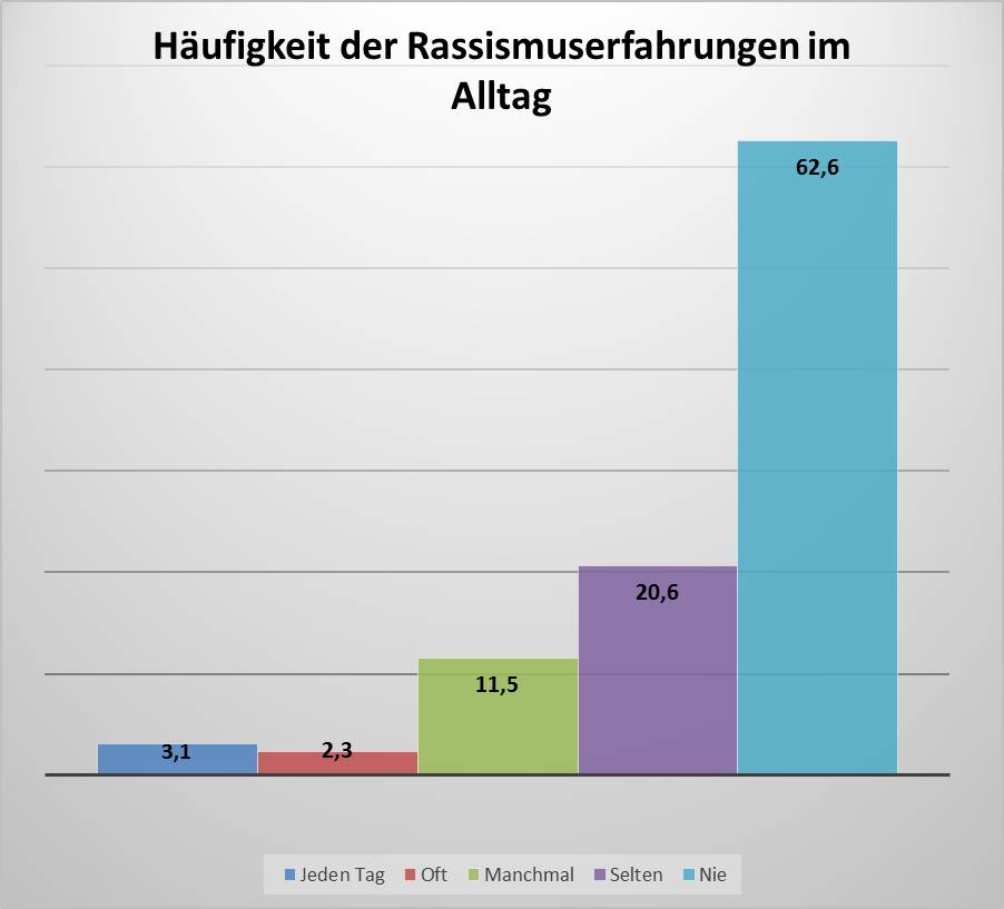 Im Bereich der offenen Antwortmöglichkeiten wurden einige zum Teil sehr eindrückliche Erfahrungen mit Rassismus geschildert. Der Umgang mit sprachlichen Defiziten wurde mehrfach als rassistisch konjungiert empfunden. Besonders gravierend erschien neben den rassistischen Handlungen als solchen die Wahrnehmung, dass Rassismus in Schule und Gesellschaft nicht ernst genommen oder den Betroffenen nicht geglaubt wurde.